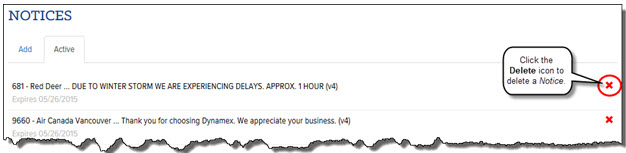 · On the Notices page, on the Active tab, click the(Delete) icon next to the Notice you want to delete, as shown: