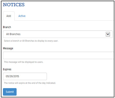 On the Add tab, in the Branch field, click the drop-down arrow and select a specific branch or select All Branches. Note: The Notice will display to all Users assigned to the selected branch.