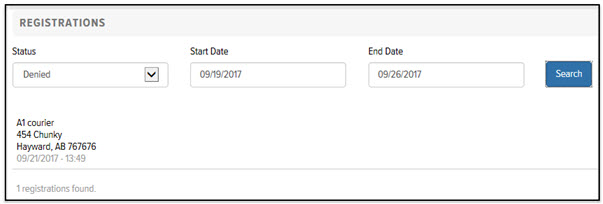 Click Search. The Registrations that match the filter criteria you defined display in the Registrations list, as shown: