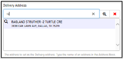 In the Delivery Address field, type a partial address or the entire address. A list of possible matches displays. From the list, click the address that you want to always display on the delivery side of the order, as shown: