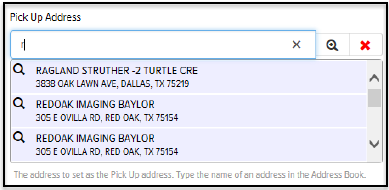 In the Pick Up Address field, type a partial address or the entire address. A list of possible matches displays. From the list, click the address that you want to always display on the pickup side of the order, as shown: