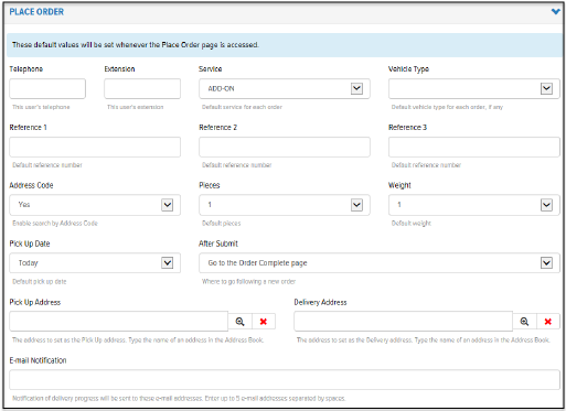 The Place Order section allows you to define default values for the fields on the Place Order page.