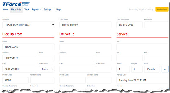 · On the Final Mile Track Main Menu Bar, click Place Order, as shown: