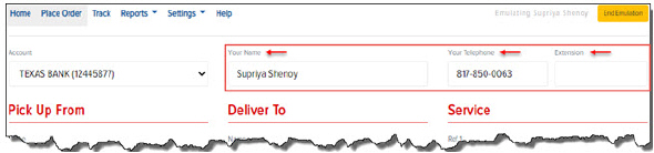 Click the desired level of service for the shipment. The Place Order page appears. The service that you selected is displayed in the Service section > Service field, as shown: