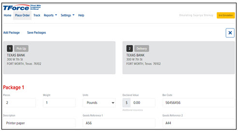 The first step in creating a new order is to place the order. On the Place Order page, you can define the Pick Up and Delivery addresses. You can also define References and a service level for the shipment.