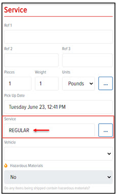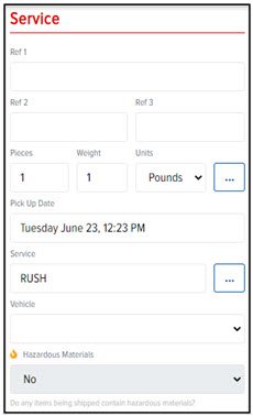 In the Service section, you can define Reference Codes, goods (including pieces, weight, units, dollar value), Pick Up Date, Service, Vehicle, and Hazardous Materials.