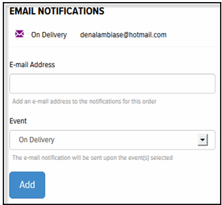 In the Event field, click the drop-down arrow and select On Delivery, When in Progress, When in Progress and On Delivery, Waybill/Bill of Lading. Note: If you select “Waybill/Bill of Lading,” a link to the waybill is included in the notification email.