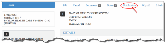 On the Saved Orders Details page, click the Notifications link, as shown: