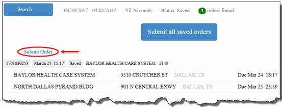 On the Saved Orders page, search for the order that you want to submit.