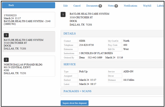 On the Saved Orders page, you can view details for a saved order including service details, attached documents, order notes, and package/scan details, etc.