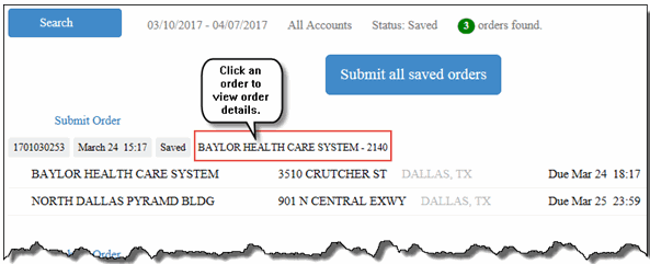· On the Saved Orders page, in the Saved Orders list, click the order that you want to view, as shown: