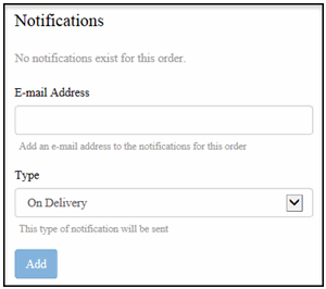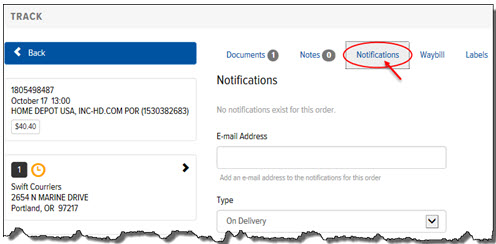 In the Type field, click the drop-down arrow and select On Delivery, When in Progress, When in Progress and On Delivery, Waybill/Bill of Lading. Note: If you select “Waybill/Bill of Lading,” a link to the waybill is included in the notification email.