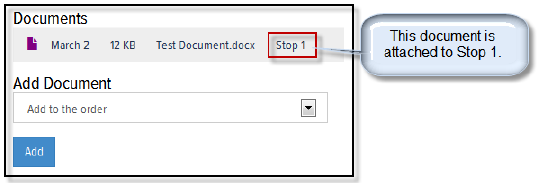Navigate to the desired file, and double-click it. The document displays in the Documents list. If the document is attached to a specific stop, the stop is also displayed, as shown: