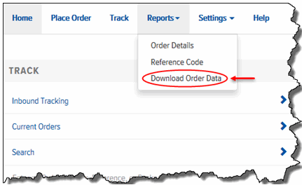 On the Final Mile Track Main Menu Bar, click Reports, and select Download Order Data, as shown: