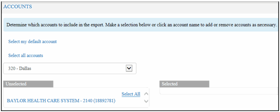 In the Unselected column, click the accounts that you want to include in the report. The accounts move to the Selected column. Or, to select all of the accounts, click the Select All link.