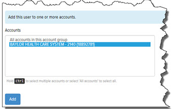 In the Accounts section, select the accounts to which you want to add the User. To select multiple accounts, press Ctrl as you click the desired accounts. Select “All Accounts in this Account Group” if you want to add the User to all accounts.