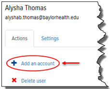 On the User page > Actions tab, click the Add an Account link, as shown: